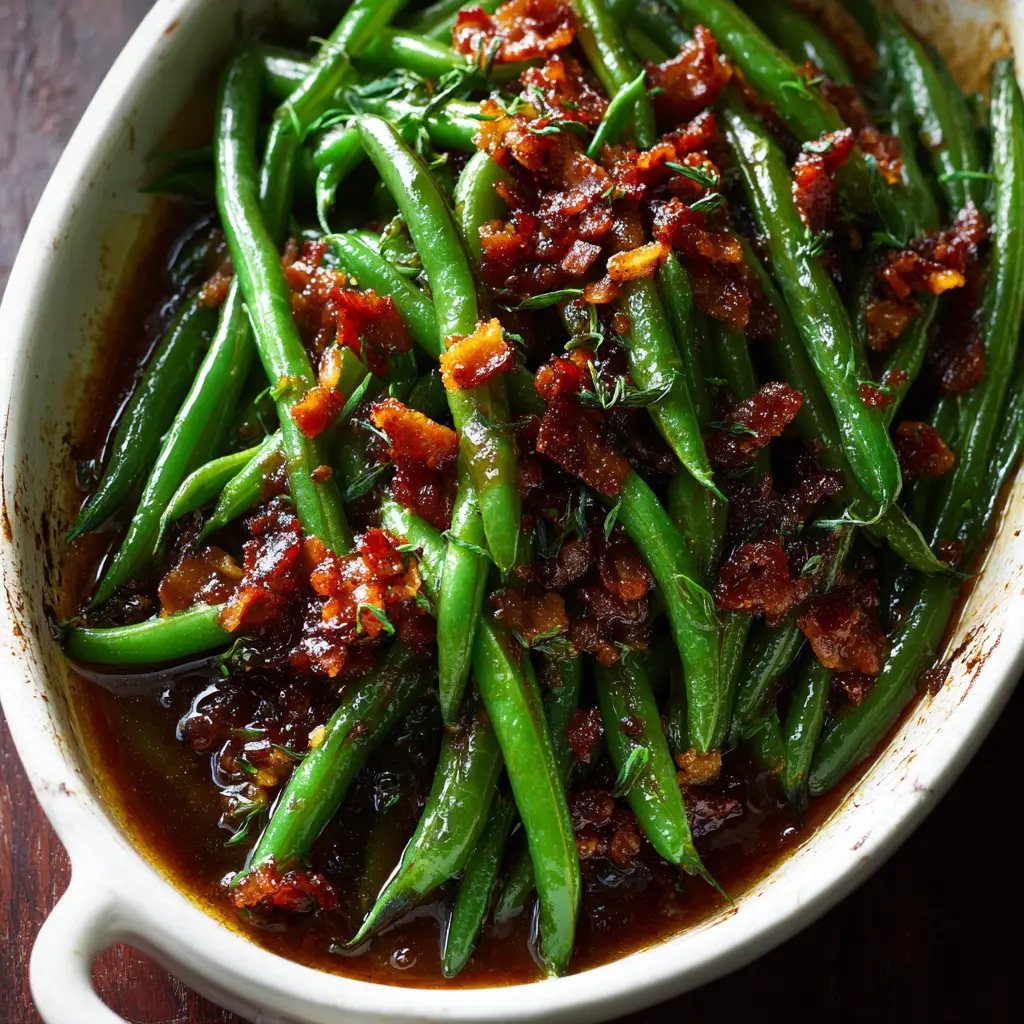 An irresistible side dish featuring crisp-tender green beans and salty bacon tossed in a sweet and savory garlic brown sugar glaze. Perfect for holidays or weeknight dinners.