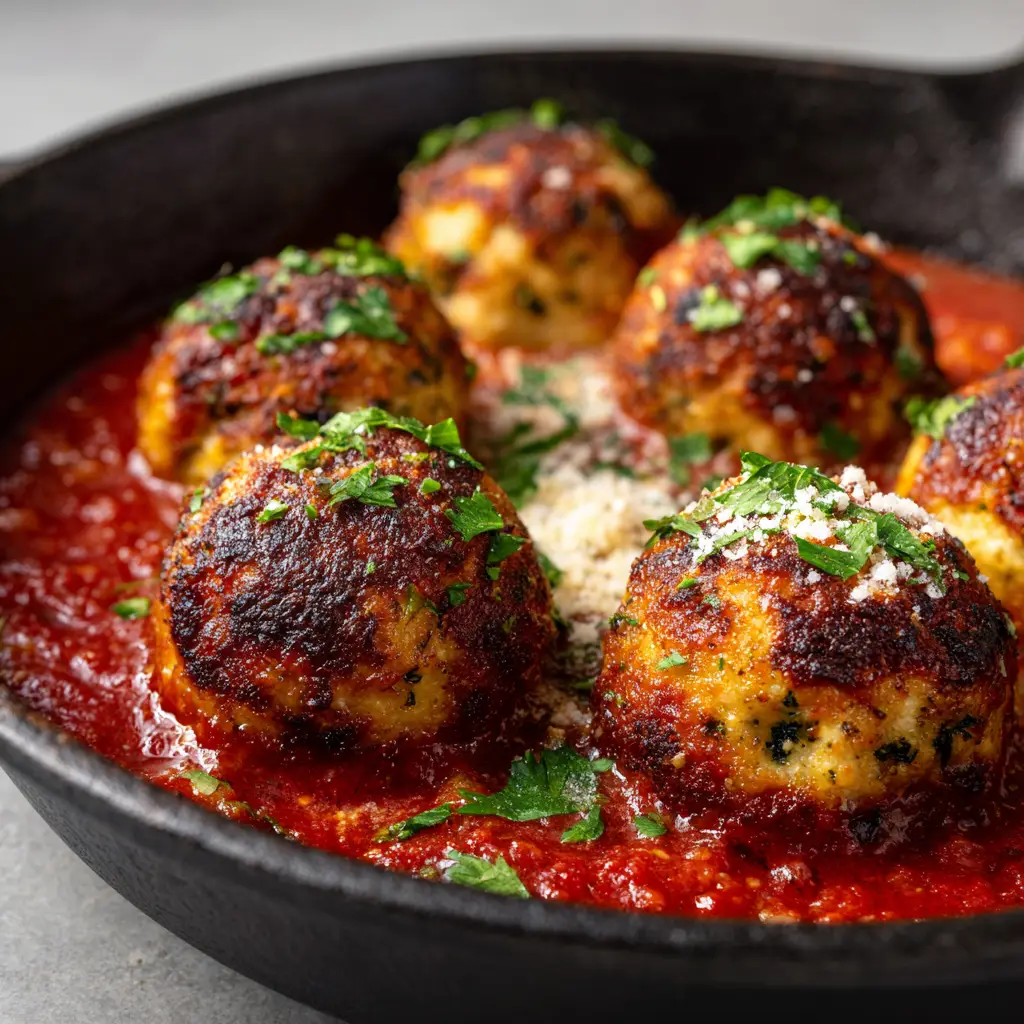 3. While meatballs bake, warm the marinara sauce in a cast-iron skillet over medium heat. Transfer the baked meatballs into the simmering sauce. Garnish generously with more grated Parmesan and finely chopped parsley before serving.