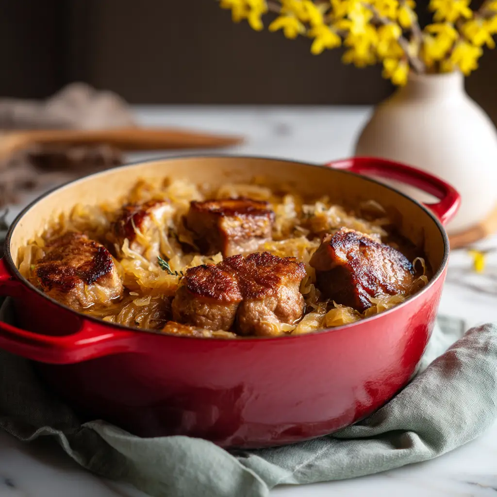 Discover the most flavorful and authentic Bavarian Pork and Sauerkraut recipe! This one-pot meal features tender pork shoulder braised with tangy sauerkraut, sweet apples, and dark beer for a hearty, comforting German classic.