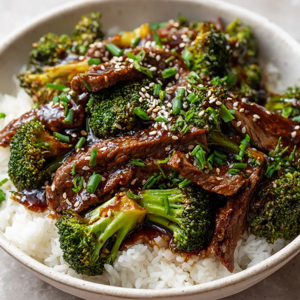 - Return the seared beef and blanched broccoli to the wok. Toss until fully coated in the sauce. Serve immediately over fluffy steamed white rice, garnished with toasted sesame seeds and chopped scallions.