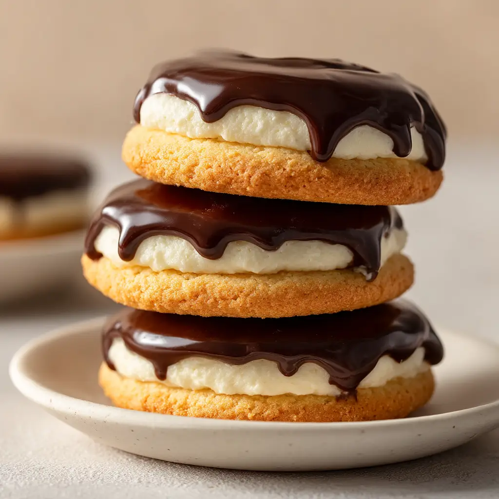 A close-up of delicious Boston Cream Pie Cookies on a plate. The cookies are filled with vanilla pastry cream and topped with a rich chocolate ganache.