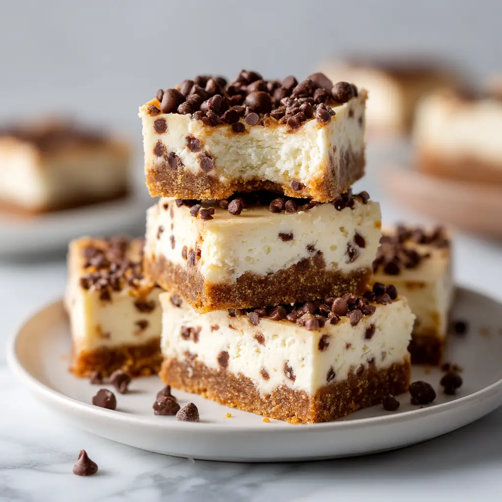 A stack of creamy Cannoli Cheesecake Bars on a white plate, topped with mini chocolate chips and a dusting of powdered sugar. The perfect Italian-American dessert recipe.
