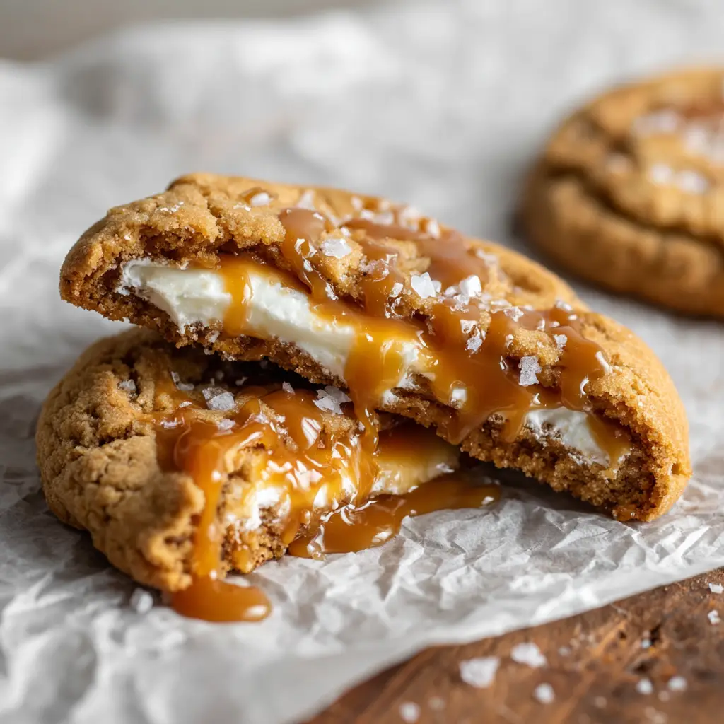 Gooey, stuffed center of smooth white cream cheese filling and thick, amber-colored melted caramel inside a golden-brown cookie.