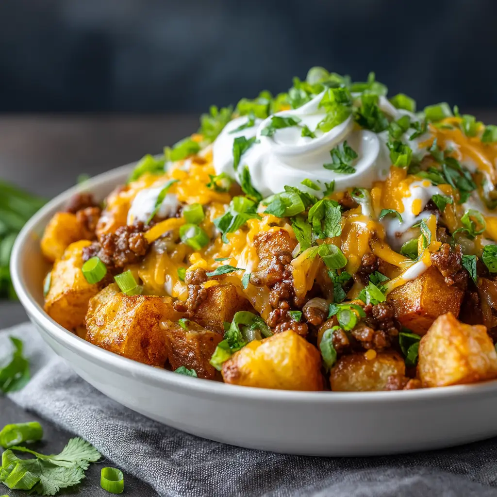 This Cheesy Taco Potatoes recipe is the ultimate comfort food, combining crispy roasted potatoes with savory taco-seasoned ground beef and a generous layer of melted cheese. An easy, delicious, and satisfying weeknight dinner the whole family will love.