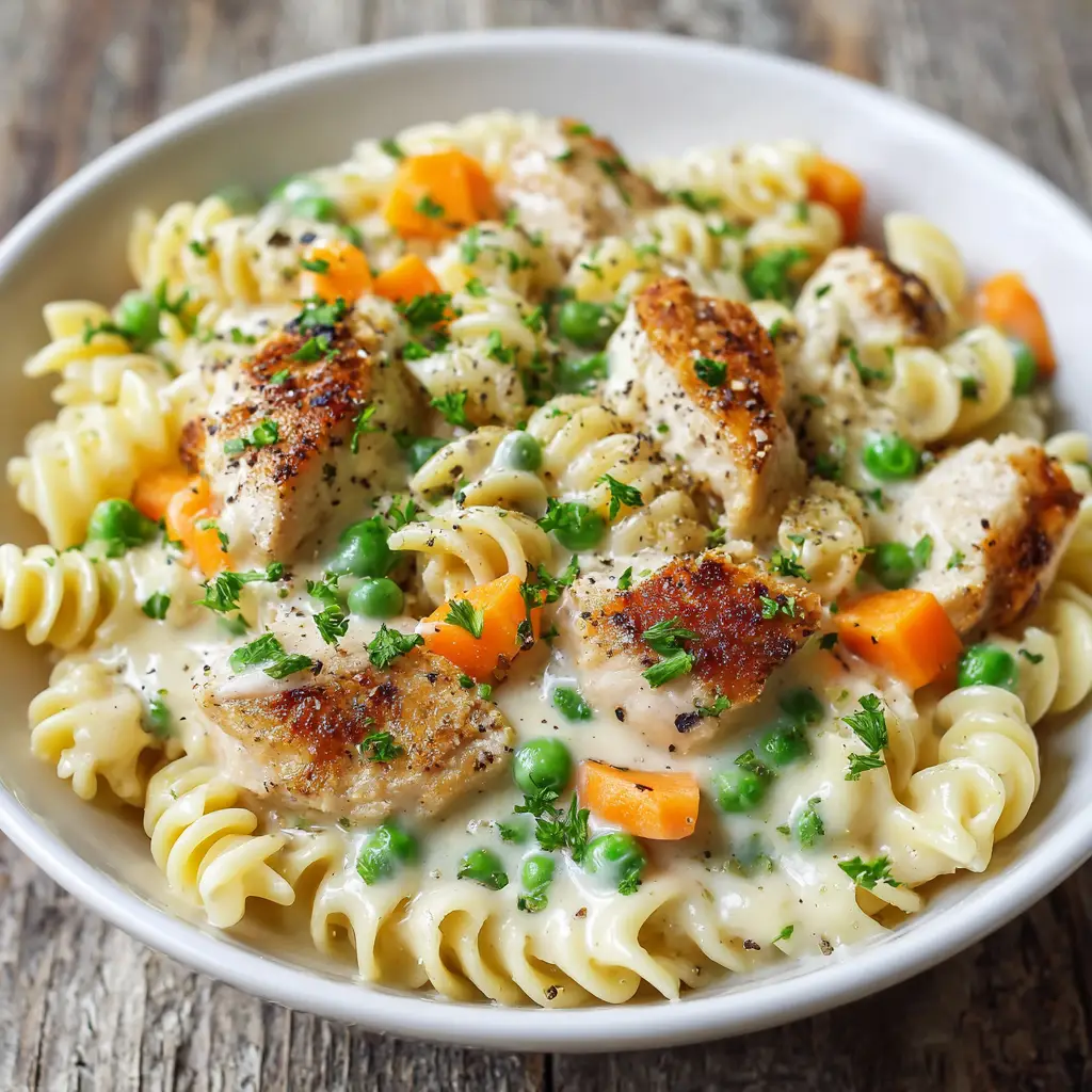Dotted throughout this creamy pasta are tender, pan-seared golden-brown chicken breast chunks, vibrant pops of bright green sweet peas, and sweet, diced orange carrots. Finished with a sprinkle of freshly chopped parsley and a crack of black pepper, this dish is a feast for the eyes and the soul, captured perfectly like a candid photo on a rustic wooden table.