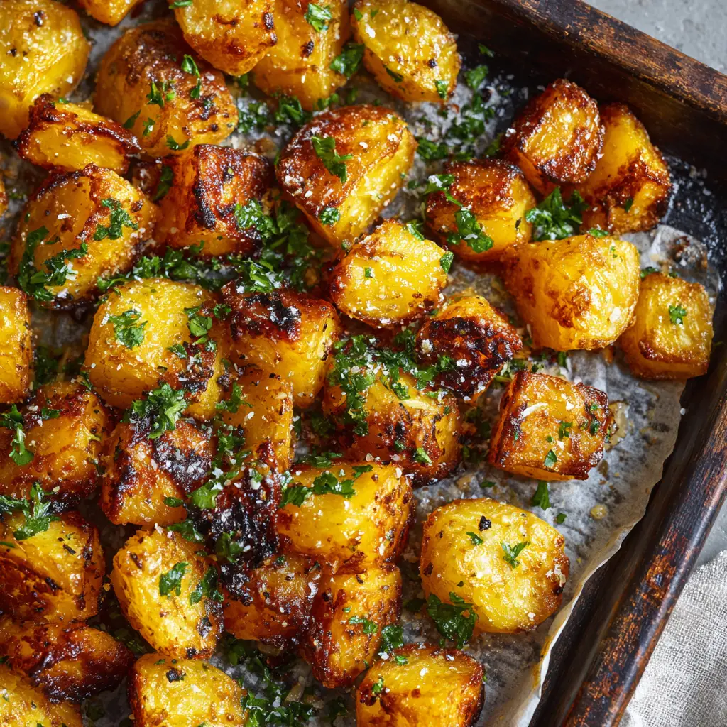 Master the science of the ultimate crispy baked potatoes. Featuring deeply golden brown chunks, blistered crunchy edges, and a fluffy center, coated with coarse sea salt and fresh parsley.