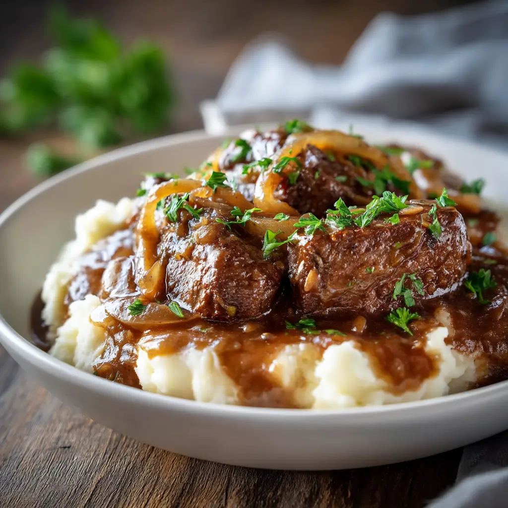 - Combine and Cook: Scatter the sliced onions over the steaks in the crock pot. Pour the prepared gravy mixture evenly over the top.