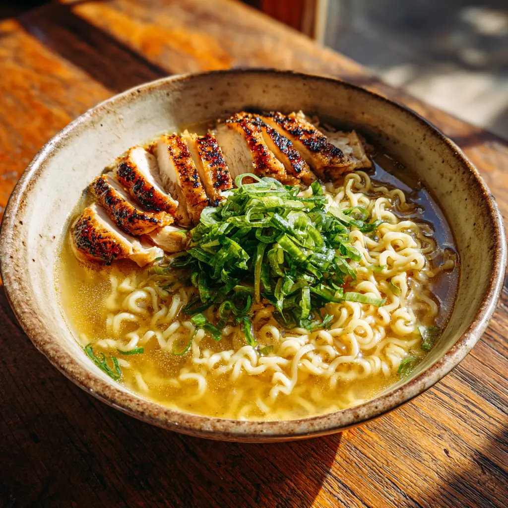 To assemble, place a generous nest of the curly ramen noodles at the bottom of a rustic ceramic bowl. Ladle the hot, steaming golden broth over the noodles. Fan the slices of pan-seared chicken out on one side. Garnish generously with the chopped fresh scallions in the center and serve immediately.