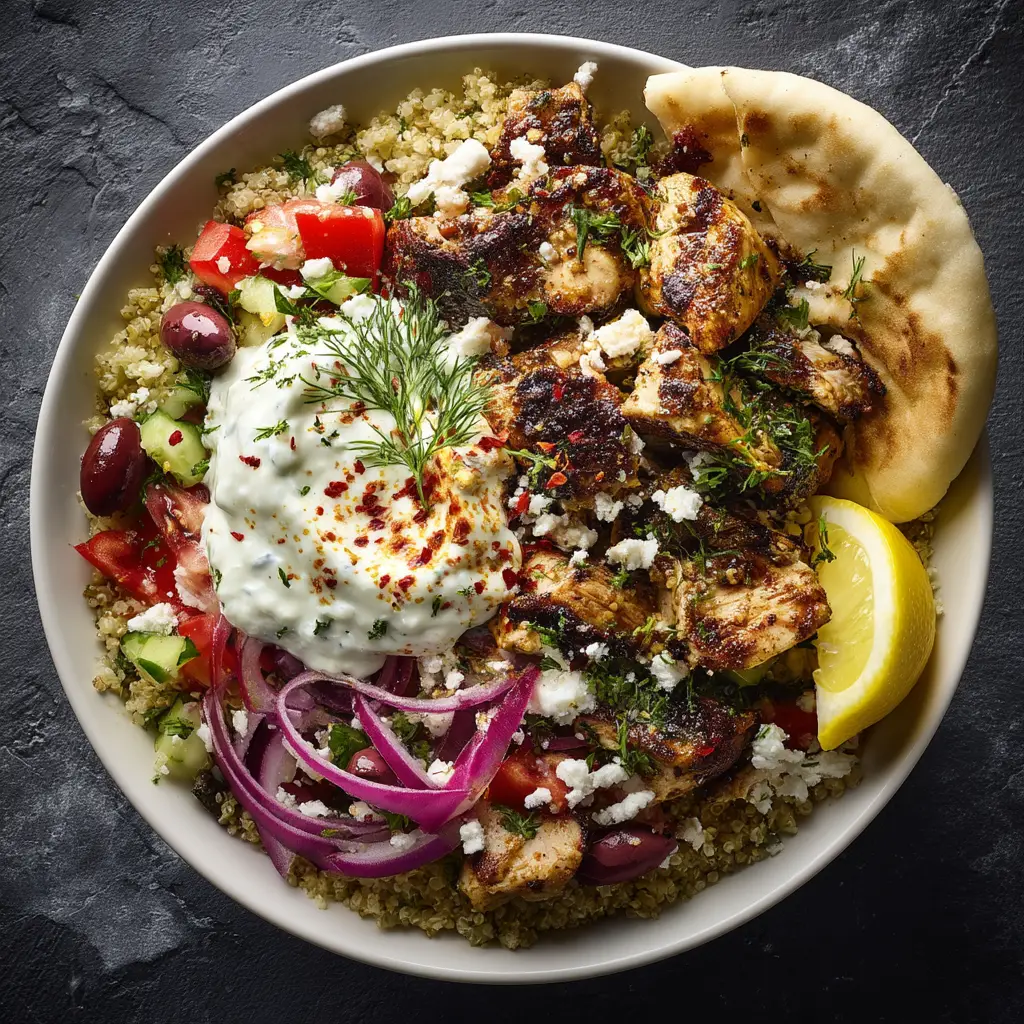 The secret to an unforgettable Greek Chicken Gyro Bowl lies in the marinade. We use a simple but potent combination of lemon juice, olive oil, garlic, and classic Greek herbs like oregano. This not only tenderizes the chicken but also infuses it with an authentic, sun-drenched flavor that is simply irresistible. Paired with a cooling, creamy tzatziki sauce, every bite is a perfect balance of savory, tangy, and fresh.