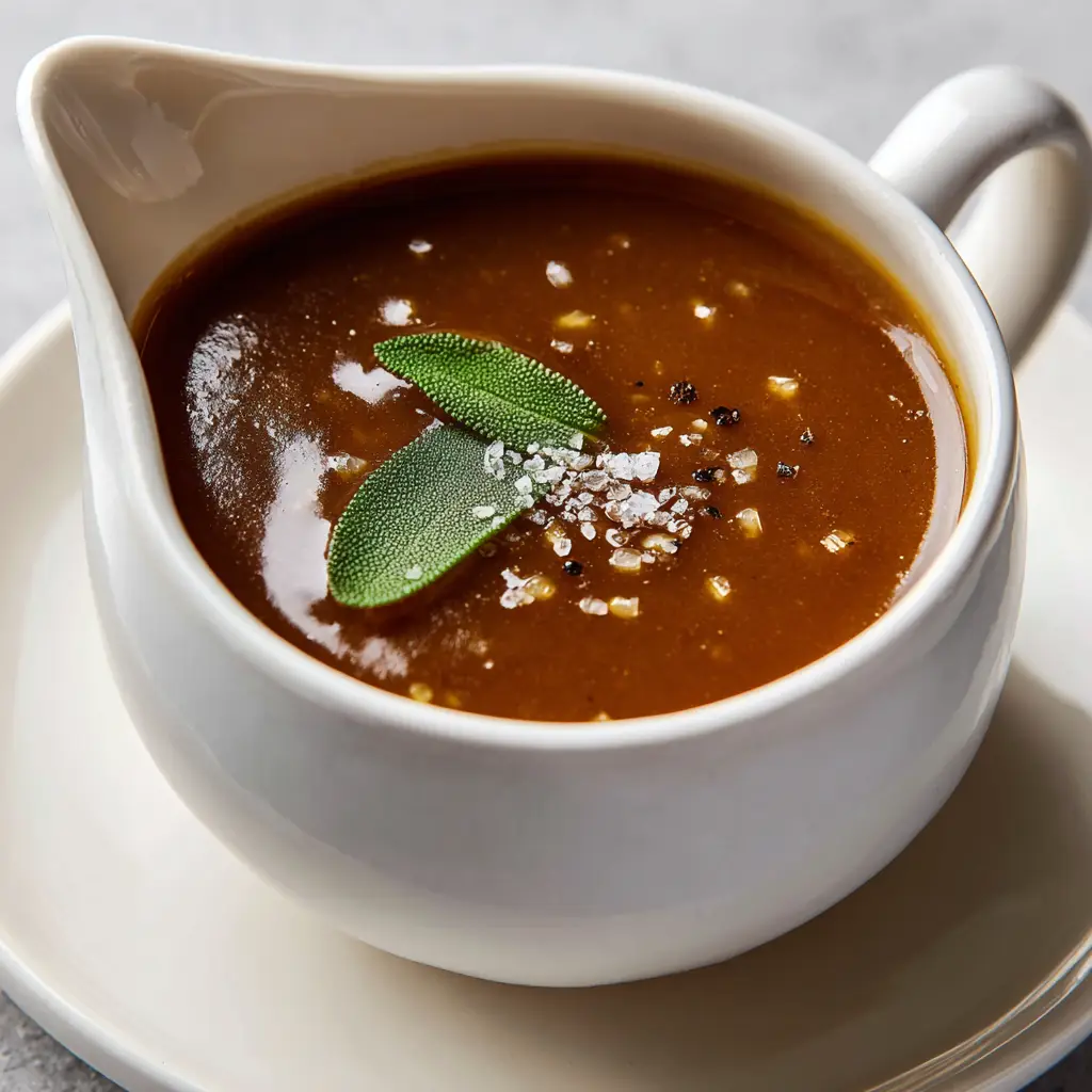 What truly sets this Homemade Turkey Gravy apart is the addition of finely diced, slow-cooked translucent onions that remain perfectly suspended throughout the savory liquid. These tiny, sweet aromatics melt in your mouth, providing a burst of deep, caramelized flavor with every single bite. Garnished simply with a single fresh green sage leaf and a tiny sprinkle of coarse cracked black pepper, this sauce is a true culinary masterpiece. Let’s dive into the science, the technique, and the secrets behind this flawless roast companion.
