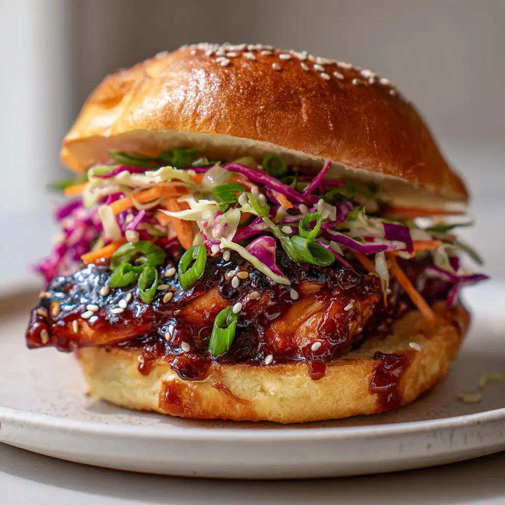 To assemble, place a glazed chicken thigh on each bottom bun. Top with a generous amount of the crunchy, creamy slaw. Garnish with a sprinkle of toasted white sesame seeds and finely chopped green scallions.