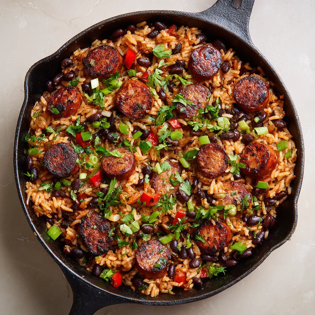 A rustic cast iron skillet filled with fluffy reddish-brown seasoned rice, plump black beans, and charred smoked sausage slices, garnished with fresh parsley, green onions, and red bell peppers.