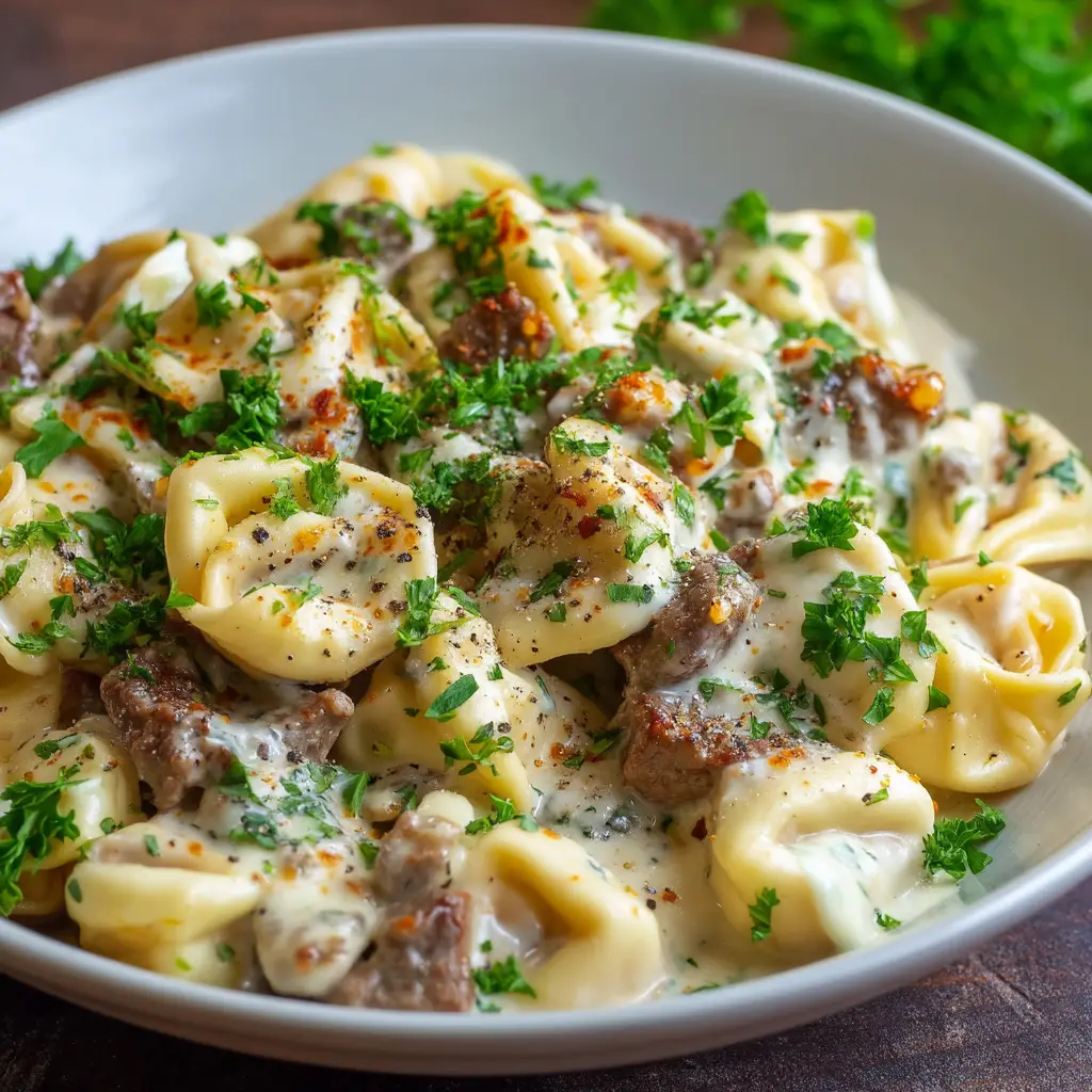 A skillet of creamy Philly Cheesesteak Tortellini, garnished with fresh parsley. The dish shows tender steak, peppers, and tortellini in a cheesy sauce.