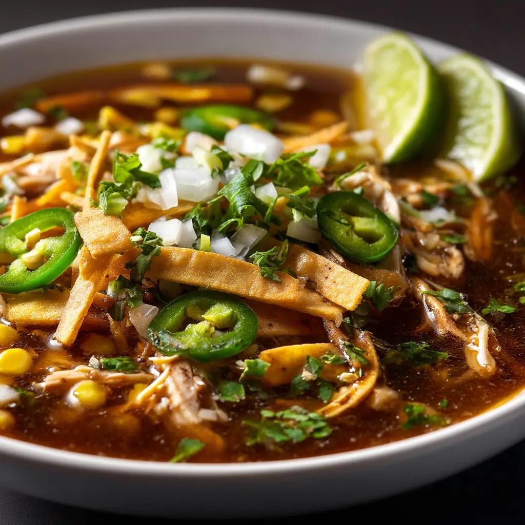 The best toppings provide a mix of textures and flavors. We highly recommend crispy tortilla strips, diced avocado, shredded Monterey Jack or cotija cheese, a dollop of sour cream, fresh cilantro, and a squeeze of fresh lime juice.