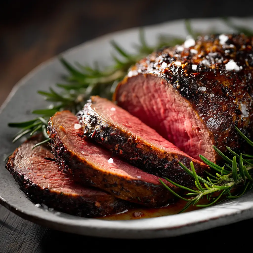 Slices of medium-rare beef tenderloin arranged on a platter, highlighting the perfect cooking temperature. The meat is juicy and perfectly pink in the center.