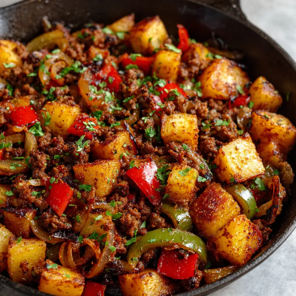 A rustic cast-iron skillet filled with Smoky Ground Beef and Potatoes, featuring crispy diced potatoes, caramelized onions, red and green peppers, and a fresh parsley garnish.