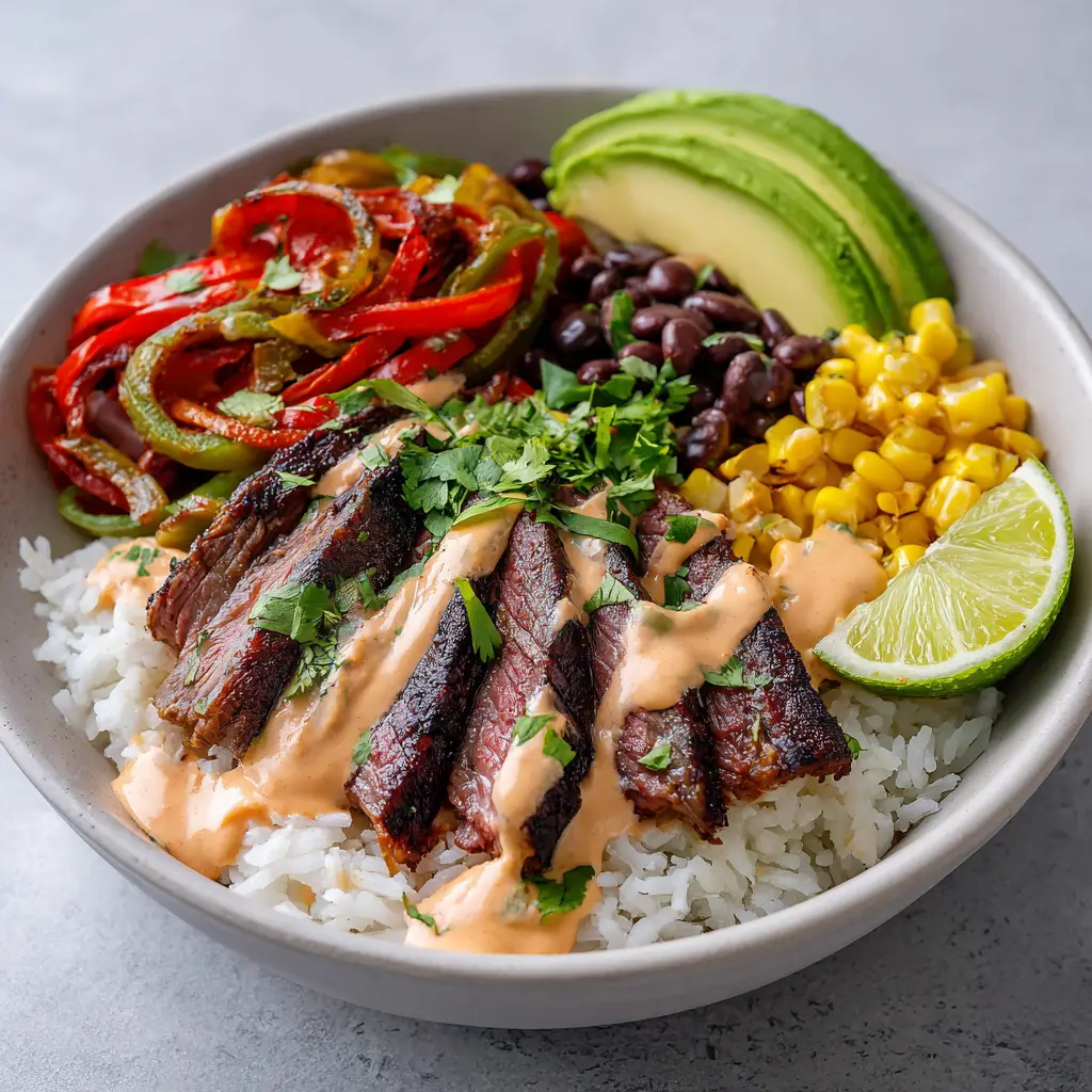 This Steak Fajita Bowl is a masterclass in texture and flavor, bringing the sizzle of your favorite restaurant right into your kitchen. Imagine a warm base of fluffy white rice, topped with a perfect fan of thinly sliced, medium-rare flank steak, boasting those irresistible dark charred edges. Every bite is a vibrant mix of blistered sweet bell peppers, tender caramelized onions, hearty black beans, and sweet roasted corn.