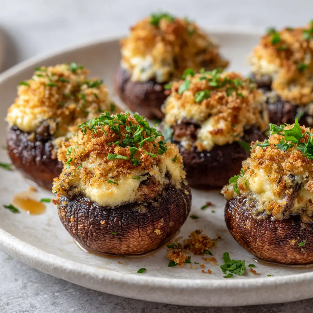 Watch for the sensory cues: the dark brown mushroom caps should develop slightly wrinkled, juicy edges, and the cream cheese should look completely melted and softened beneath the crisp breadcrumb crust. Remove them from the oven and carefully transfer them to a white ceramic serving platter. Dust generously with the finely minced fresh green parsley, and let the tiny droplets of savory cooking juices glisten around the base before serving.