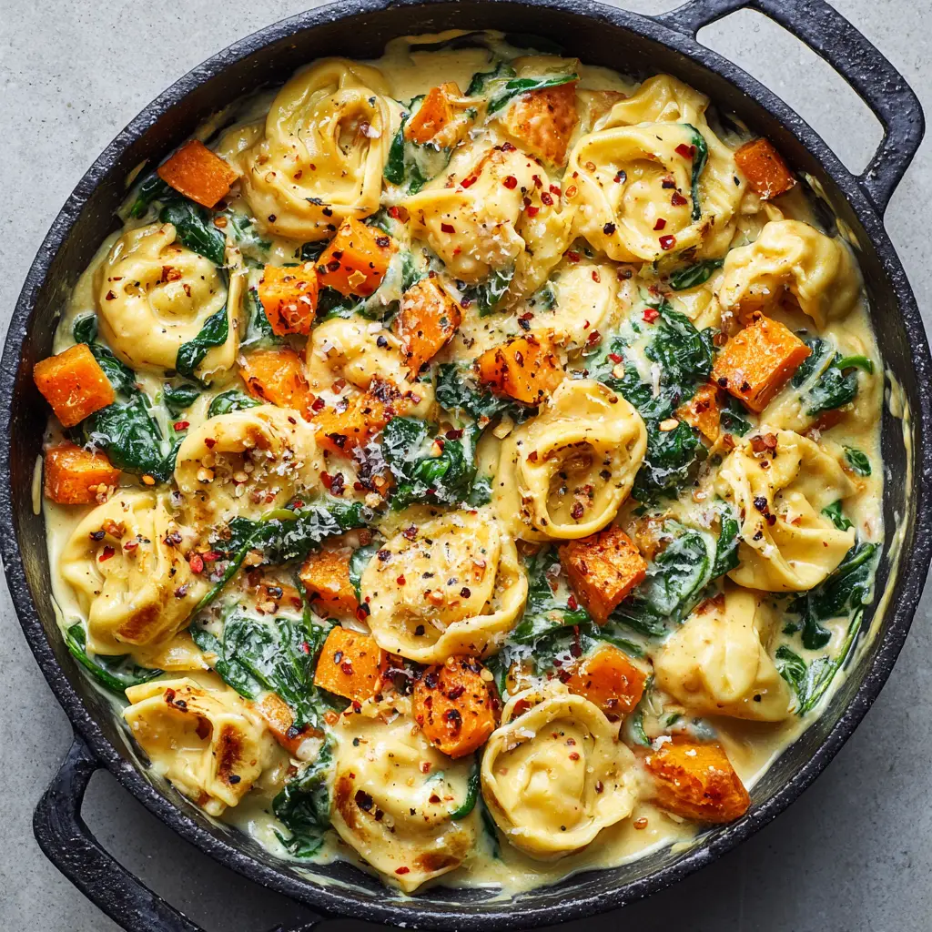 - Add the fresh baby spinach to the simmering sauce. Stir gently for 1-2 minutes until wilted and dark green. Fold the cooked tortellini and caramelized sweet potatoes back into the skillet. Toss until fully coated.