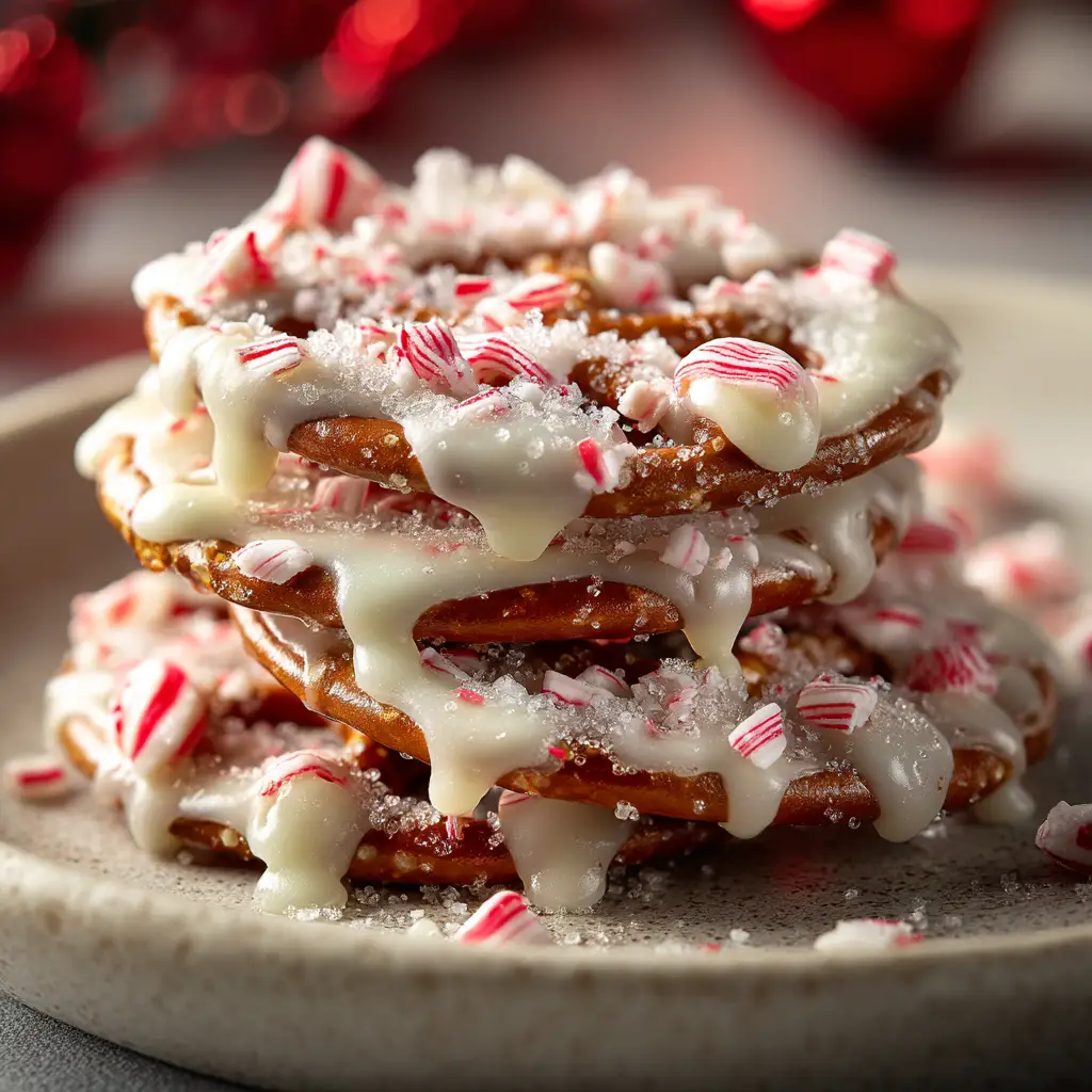 A beautiful stack of finished white chocolate peppermint pretzels ready for serving. This showcases the easy no-bake holiday treat.