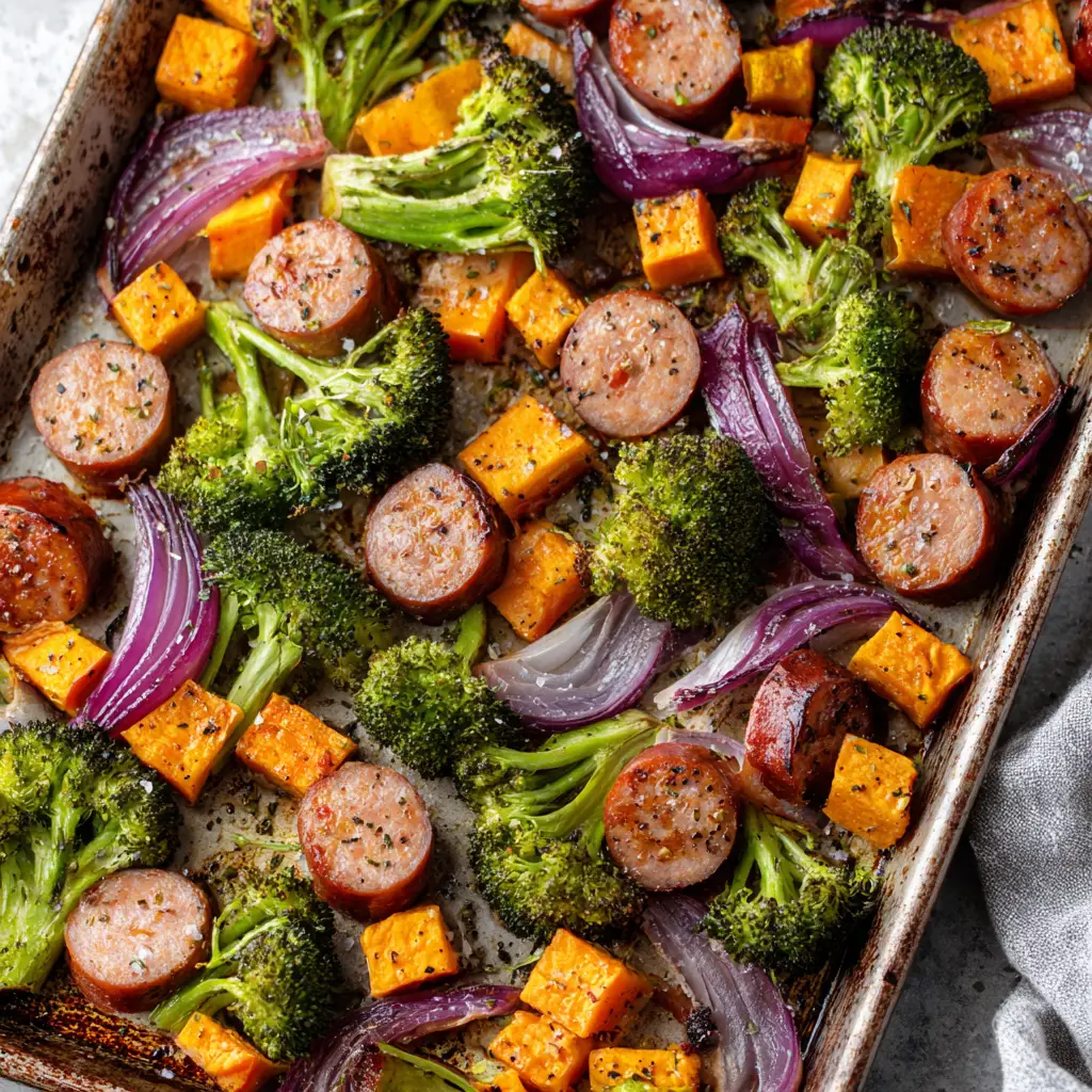 The secret is to stagger the cooking times. Roast the sweet potato cubes and red onions for 15 minutes first, then add the broccoli florets and sausage for the final 15 to 20 minutes. This ensures perfect charring without burning.